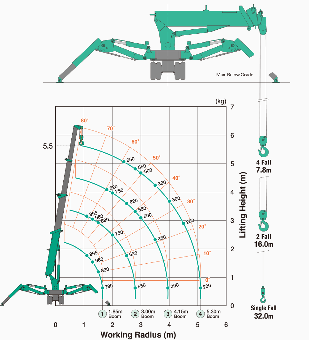 The MC104C spider crane has a maximum lifting capacity of 0.995 tons (2,190 lbs) at 1.1 meters (3.5 ft).